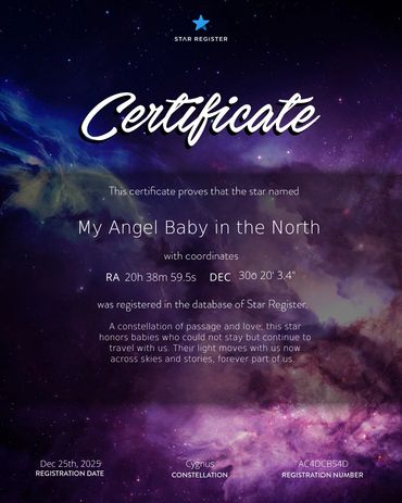 When we look up at the sky, we can see our baby in the stars. It is My Angel Baby because each of you can claim it as your own—and every loss parent can as well. By naming a star in both the Northern and Southern Hemispheres, no matter where we are in the world, our babies are always above us.
